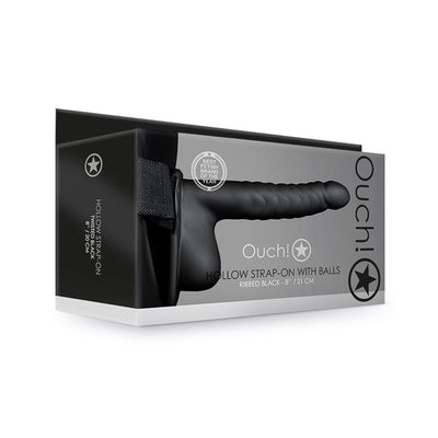 Ouch! 8 in. Ribbed Hollow Strap-On With Balls Black