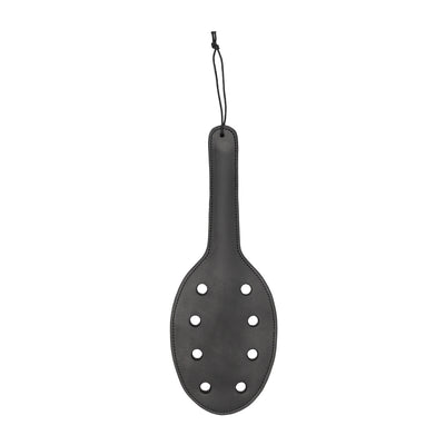 @winter2019-63Saddle Leather Paddle With 8 Holes - Black. This SADDLE LEATHER PADDLE WITH 8 HOLES has been designed to reduce air resistance and intensify impact. The flexible broad smacking surface will spread sensations throughout the body enough to satisfy any spanking aficionado! A sturdy leather wrist loop ensures powerful and confident swings and stings; from a light tap through to a severe slap this paddle will never let you down! The paddle has a total length of 39.5cm (15.5”) a maximum width of 14.8cm (5.8”) and weighs a hefty 400grams (14.2oz.)